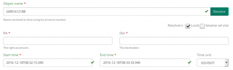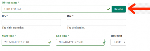The top panel of the interface allows to resolve a GRB time. Coordinates are not rilevant.