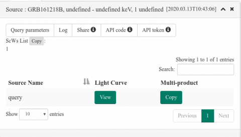 Click on the "View" button on the right of the source object to display the lightcurve.