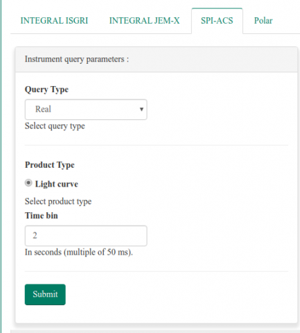 Set the time bin width and unit for the lightcurve (the minimum is 50 ms). Remind that the start and end time of the lightcurve are determined by the time limits set in the top multi-instrument panel.
